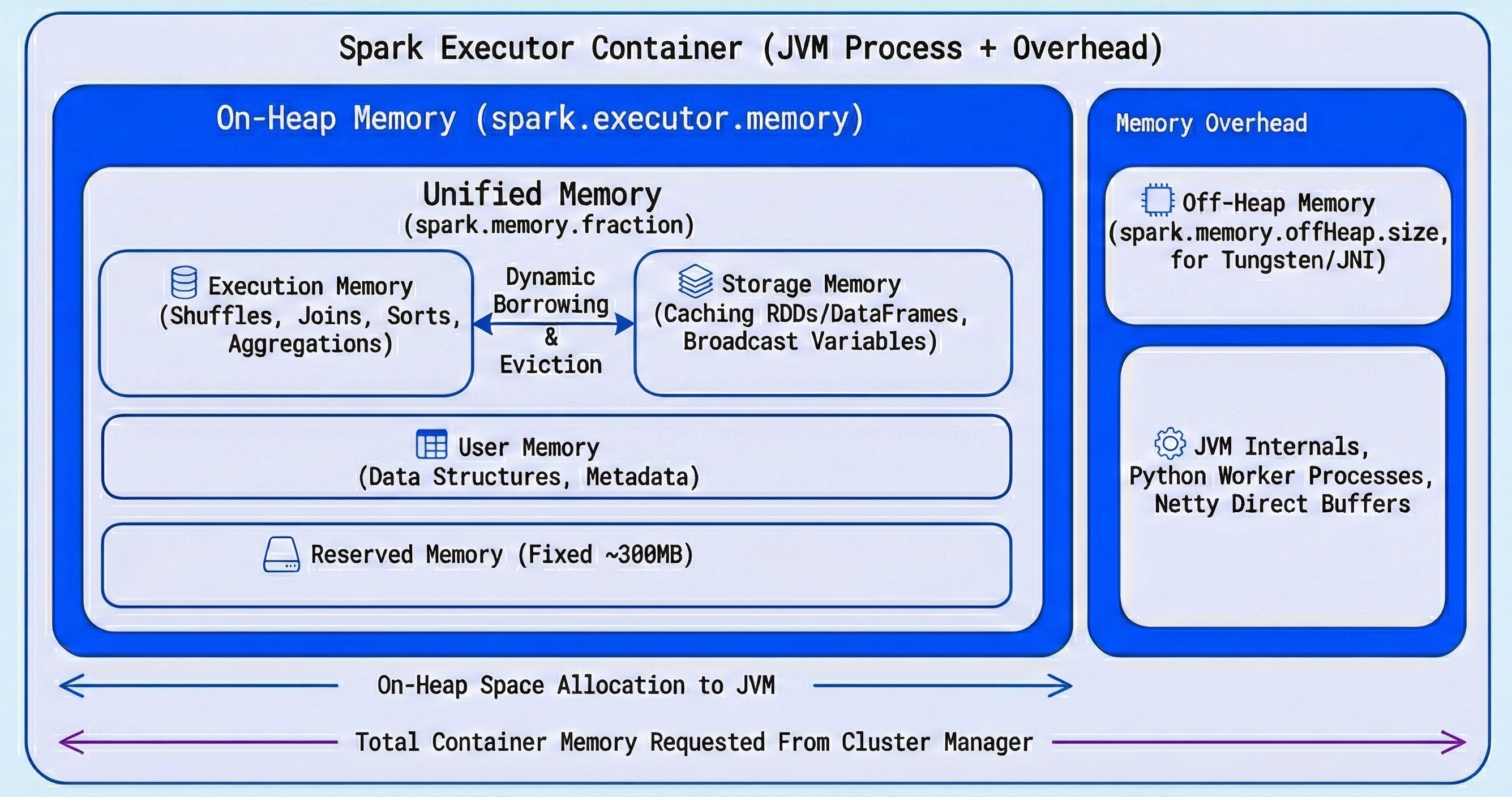| Memory Overhead | spark.executor.memoryOverhead | max(384MB, 10% of spark.executor.memory) | Off-heap memory for JVM internals, Python workers, native libs. |