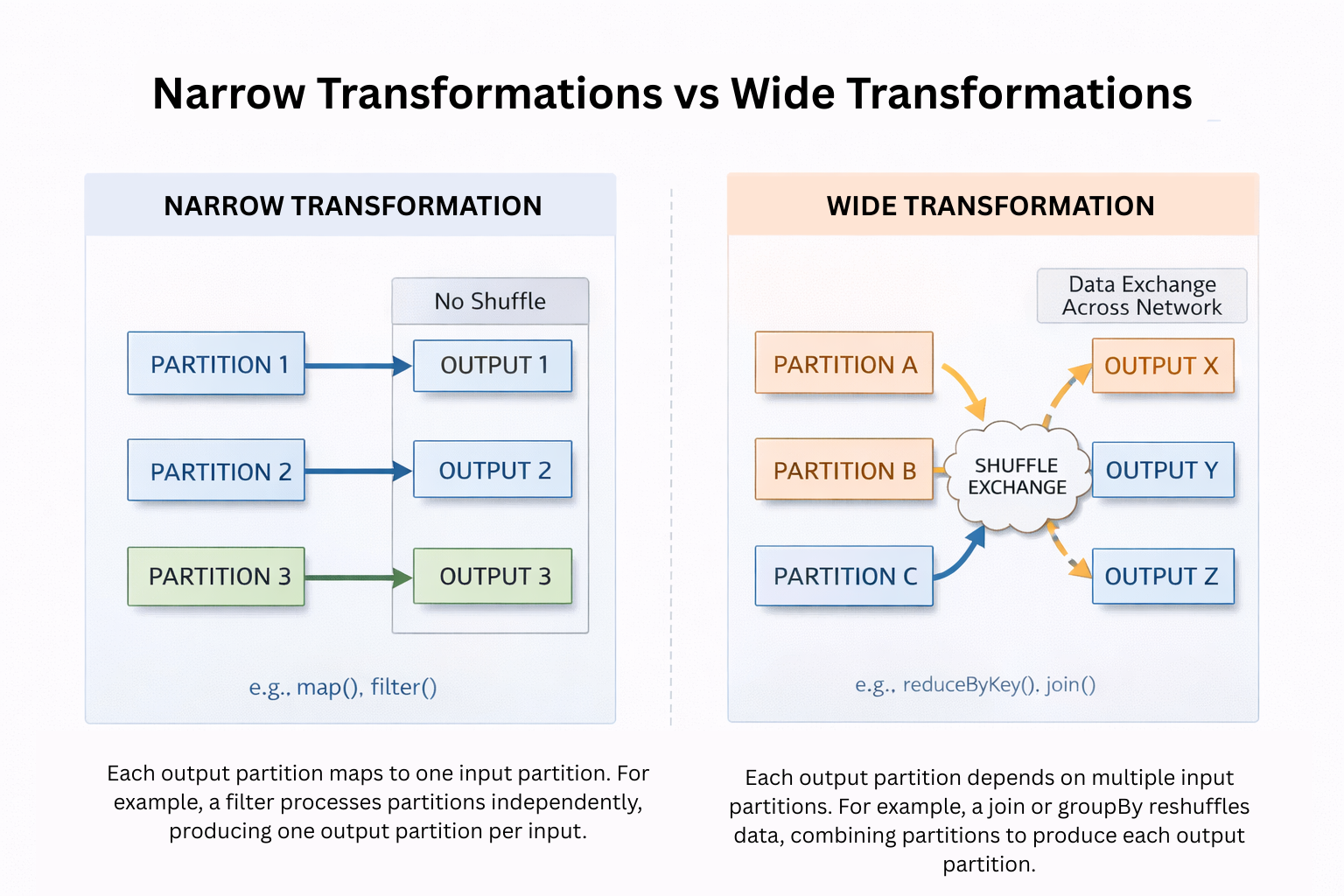 | Partition dependency | 1-to-1 (each output partition depends on only one input partition) | Many-to-many (output partitions need data from multiple input partitions) |